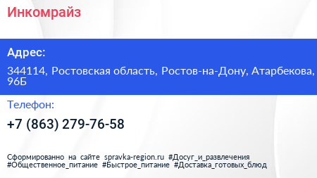 Инкомрайз по адресу 344114, Ростовская область, Ростов-на-Дону, Атарбекова, 96Б в дальнейшем Организация, размещена в следующих категориях: