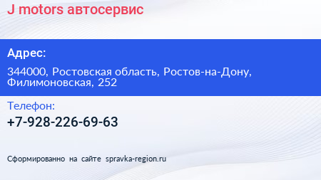 J-motors, автосервис по адресу 344000, Ростовская область, Ростов-на-Дону, Филимоновская, 252 в дальнейшем Организация, размещена в следующих категориях:
