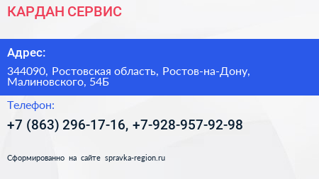 КАРДАН СЕРВИС по адресу 344090, Ростовская область, Ростов-на-Дону, Малиновского, 54Б в дальнейшем Организация, размещена в следующих категориях: