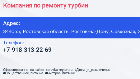 Компания по ремонту турбин по адресу 344055, Ростовская область, Ростов-на-Дону, Совхозная, 2 в дальнейшем Организация, размещена в следующих категориях: