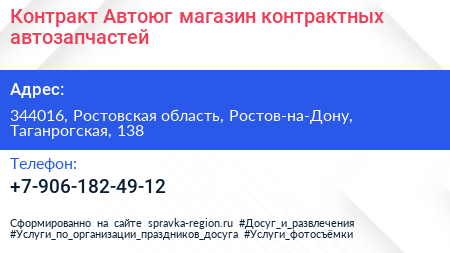 Контракт-Автоюг, магазин контрактных автозапчастей по адресу 344016, Ростовская область, Ростов-на-Дону, Таганрогская, 138 в дальнейшем Организация, размещена в следующих категориях: