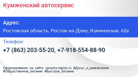 Кумженский, автосервис по адресу Ростовская область, Ростов-на-Дону, Кумженская, 62а в дальнейшем Организация, размещена в следующих категориях: