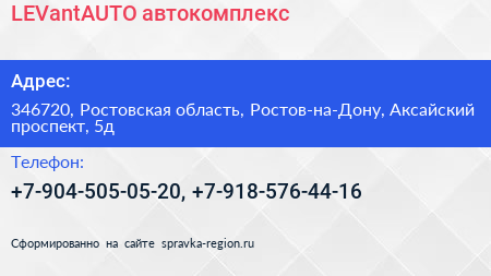 LEVantAUTO, автокомплекс по адресу 346720, Ростовская область, Ростов-на-Дону, Аксайский проспект, 5д в дальнейшем Организация, размещена в следующих категориях: