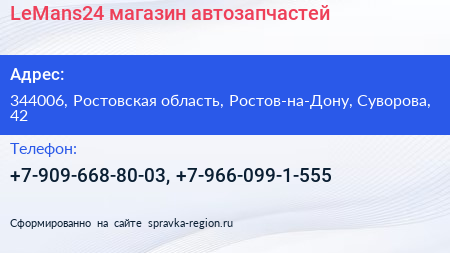 LeMans24, магазин автозапчастей по адресу 344006, Ростовская область, Ростов-на-Дону, Суворова, 42 в дальнейшем Организация, размещена в следующих категориях: