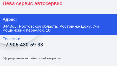 Лёва-сервис, автосервис по адресу 344065, Ростовская область, Ростов-на-Дону, 7-й Рощинский переулок, 10 в дальнейшем Организация, размещена в следующих категориях: