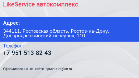 LikeService, автокомплекс по адресу 344111, Ростовская область, Ростов-на-Дону, Днепродзержинский переулок, 110 в дальнейшем Организация, размещена в следующих категориях: