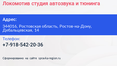Локомотив, студия автозвука и тюнинга по адресу 344016, Ростовская область, Ростов-на-Дону, Дебальцевская, 14 в дальнейшем Организация, размещена в следующих категориях: