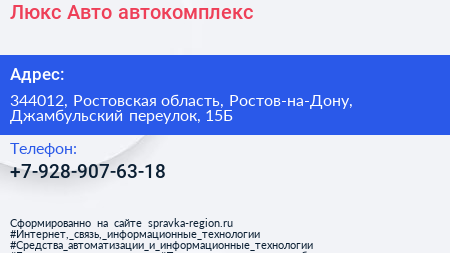 Люкс Авто, автокомплекс по адресу 344012, Ростовская область, Ростов-на-Дону, Джамбульский переулок, 15Б в дальнейшем Организация, размещена в следующих категориях: