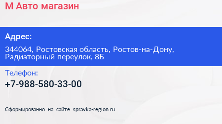 М Авто, магазин по адресу 344064, Ростовская область, Ростов-на-Дону, Радиаторный переулок, 8Б в дальнейшем Организация, размещена в следующих категориях: