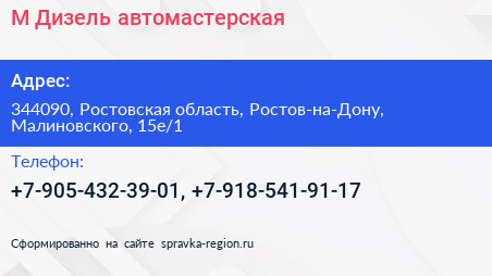 М Дизель, автомастерская по адресу 344090, Ростовская область, Ростов-на-Дону, Малиновского, 15е/1 в дальнейшем Организация, размещена в следующих категориях: