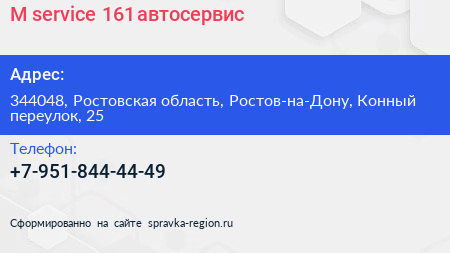 M-service-161, автосервис по адресу 344048, Ростовская область, Ростов-на-Дону, Конный переулок, 25 в дальнейшем Организация, размещена в следующих категориях: