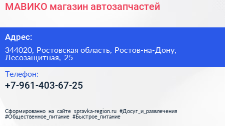 МАВИКО, магазин автозапчастей по адресу 344020, Ростовская область, Ростов-на-Дону, Лесозащитная, 25 в дальнейшем Организация, размещена в следующих категориях: