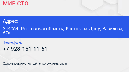 МИР, СТО по адресу 344064, Ростовская область, Ростов-на-Дону, Вавилова, 67в в дальнейшем Организация, размещена в следующих категориях: