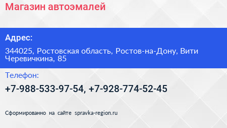 Магазин автоэмалей по адресу 344025, Ростовская область, Ростов-на-Дону, Вити Черевичкина, 85 в дальнейшем Организация, размещена в следующих категориях: