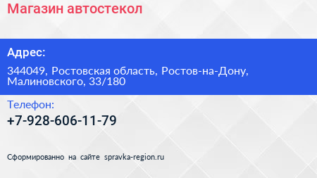 Магазин автостекол по адресу 344049, Ростовская область, Ростов-на-Дону, Малиновского, 33/180 в дальнейшем Организация, размещена в следующих категориях: