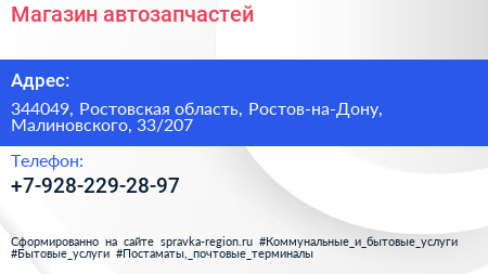 Магазин автозапчастей по адресу 344049, Ростовская область, Ростов-на-Дону, Малиновского, 33/207 в дальнейшем Организация, размещена в следующих категориях: