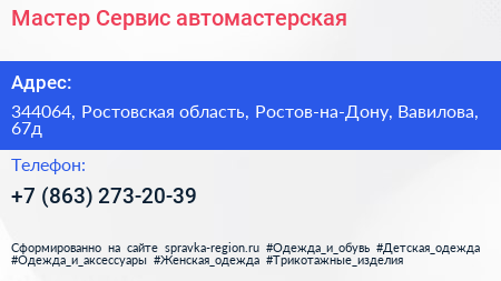 Мастер-Сервис, автомастерская по адресу 344064, Ростовская область, Ростов-на-Дону, Вавилова, 67д в дальнейшем Организация, размещена в следующих категориях: