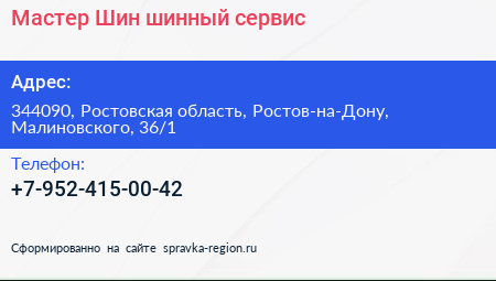 Мастер Шин, шинный сервис по адресу 344090, Ростовская область, Ростов-на-Дону, Малиновского, 36/1 в дальнейшем Организация, размещена в следующих категориях: