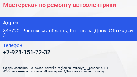 Мастерская по ремонту автоэлектрики по адресу 346720, Ростовская область, Ростов-на-Дону, Объездная, 3 в дальнейшем Организация, размещена в следующих категориях: