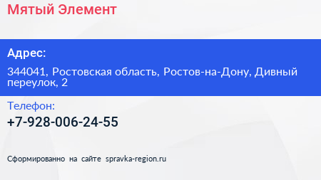 Мятый Элемент по адресу 344041, Ростовская область, Ростов-на-Дону, Дивный переулок, 2 в дальнейшем Организация, размещена в следующих категориях: