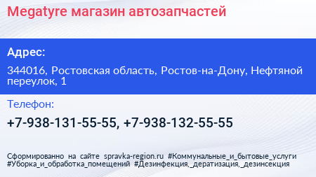 Megatyre, магазин автозапчастей по адресу 344016, Ростовская область, Ростов-на-Дону, Нефтяной переулок, 1 в дальнейшем Организация, размещена в следующих категориях: