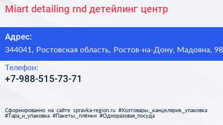 Miart detailing rnd, детейлинг-центр по адресу 344041, Ростовская область, Ростов-на-Дону, Мадояна, 98 в дальнейшем Организация, размещена в следующих категориях:
