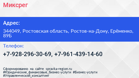 Миксрег по адресу 344049, Ростовская область, Ростов-на-Дону, Ерёменко, 89Б в дальнейшем Организация, размещена в следующих категориях: