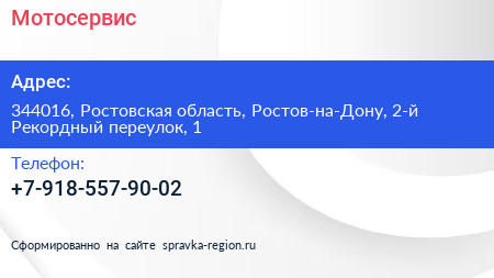 Мотосервис по адресу 344016, Ростовская область, Ростов-на-Дону, 2-й Рекордный переулок, 1 в дальнейшем Организация, размещена в следующих категориях: