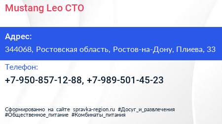 Mustang Leo, СТО по адресу 344068, Ростовская область, Ростов-на-Дону, Плиева, 33 в дальнейшем Организация, размещена в следующих категориях: