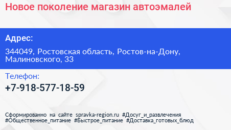 Новое поколение, магазин автоэмалей по адресу 344049, Ростовская область, Ростов-на-Дону, Малиновского, 33 в дальнейшем Организация, размещена в следующих категориях: