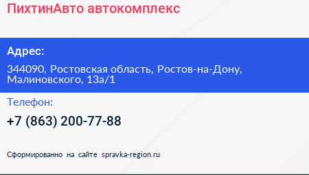 ПихтинАвто, автокомплекс по адресу 344090, Ростовская область, Ростов-на-Дону, Малиновского, 13а/1 в дальнейшем Организация, размещена в следующих категориях: