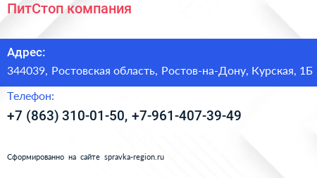 ПитСтоп, компания по адресу 344039, Ростовская область, Ростов-на-Дону, Курская, 1Б в дальнейшем Организация, размещена в следующих категориях: