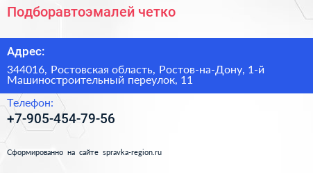 Подборавтоэмалей.четко! по адресу 344016, Ростовская область, Ростов-на-Дону, 1-й Машиностроительный переулок, 11 в дальнейшем Организация, размещена в следующих категориях: