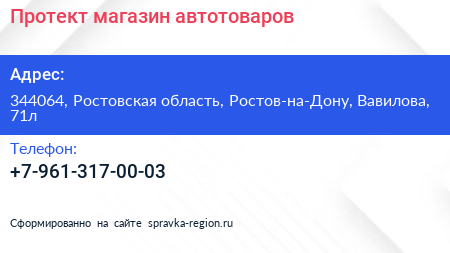 Протект, магазин автотоваров по адресу 344064, Ростовская область, Ростов-на-Дону, Вавилова, 71л в дальнейшем Организация, размещена в следующих категориях: