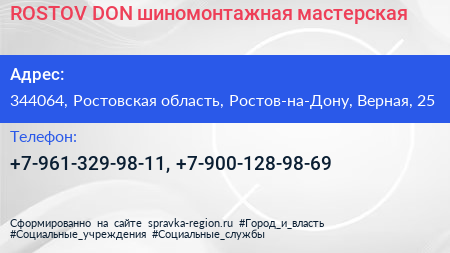 ROSTOV DON, шиномонтажная мастерская по адресу 344064, Ростовская область, Ростов-на-Дону, Верная, 25 в дальнейшем Организация, размещена в следующих категориях:
