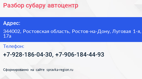 Разбор-субару, автоцентр по адресу 344002, Ростовская область, Ростов-на-Дону, Луговая 1-я, 17а в дальнейшем Организация, размещена в следующих категориях: