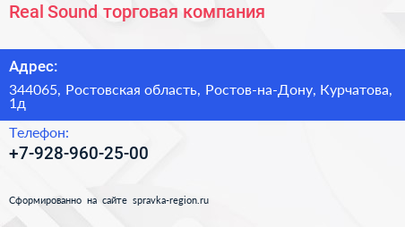 Real Sound, торговая компания по адресу 344065, Ростовская область, Ростов-на-Дону, Курчатова, 1д в дальнейшем Организация, размещена в следующих категориях:
