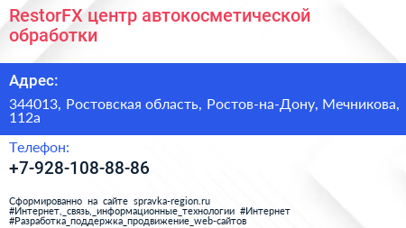 RestorFX, центр автокосметической обработки по адресу 344013, Ростовская область, Ростов-на-Дону, Мечникова, 112а в дальнейшем Организация, размещена в следующих категориях: