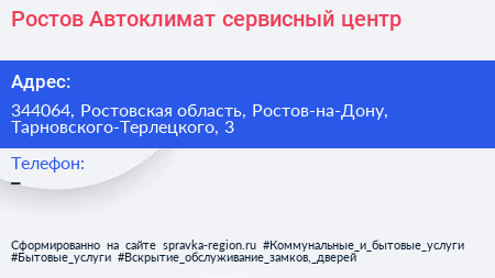 Ростов Автоклимат, сервисный центр по адресу 344064, Ростовская область, Ростов-на-Дону, Тарновского-Терлецкого, 3 в дальнейшем Организация, размещена в следующих категориях: