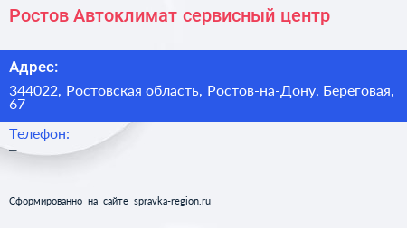 Ростов Автоклимат, сервисный центр по адресу 344022, Ростовская область, Ростов-на-Дону, Береговая, 67 в дальнейшем Организация, размещена в следующих категориях: