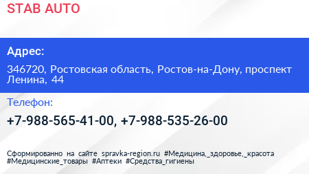 STAB AUTO по адресу 346720, Ростовская область, Ростов-на-Дону, проспект Ленина, 44 в дальнейшем Организация, размещена в следующих категориях: