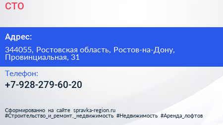 СТО по адресу 344055, Ростовская область, Ростов-на-Дону, Провинциальная, 31 в дальнейшем Организация, размещена в следующих категориях: