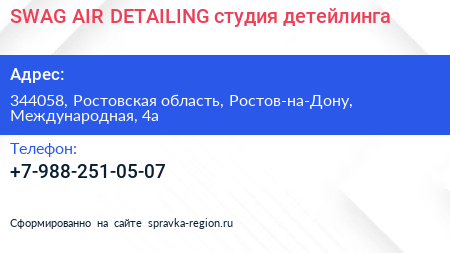 SWAG AIR DETAILING, студия детейлинга по адресу 344058, Ростовская область, Ростов-на-Дону, Международная, 4а в дальнейшем Организация, размещена в следующих категориях: