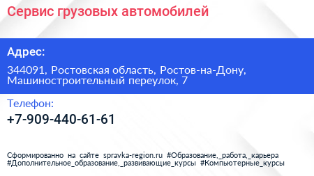 Сервис грузовых автомобилей по адресу 344091, Ростовская область, Ростов-на-Дону, Машиностроительный переулок, 7 в дальнейшем Организация, размещена в следующих категориях: