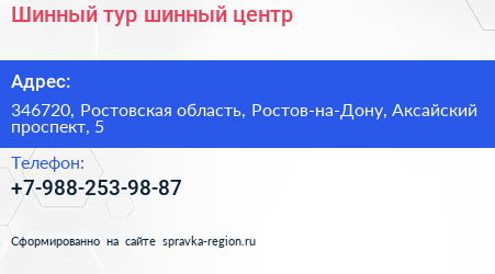 Шинный тур, шинный центр по адресу 346720, Ростовская область, Ростов-на-Дону, Аксайский проспект, 5 в дальнейшем Организация, размещена в следующих категориях: