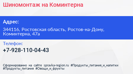 Шиномонтаж на Коминтерна по адресу 344116, Ростовская область, Ростов-на-Дону, Коминтерна, 47а в дальнейшем Организация, размещена в следующих категориях: