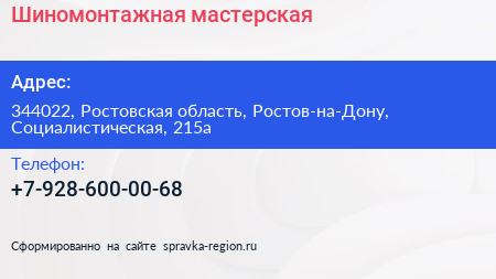 Шиномонтажная мастерская по адресу 344022, Ростовская область, Ростов-на-Дону, Социалистическая, 215а в дальнейшем Организация, размещена в следующих категориях: