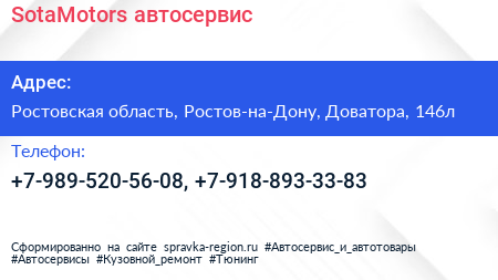 SotaMotors, автосервис по адресу Ростовская область, Ростов-на-Дону, Доватора, 146л в дальнейшем Организация, размещена в следующих категориях: