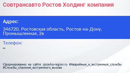 Совтрансавто-Ростов Холдинг, компания по адресу 346720, Ростовская область, Ростов-на-Дону, Промышленная, 2в в дальнейшем Организация, размещена в следующих категориях: