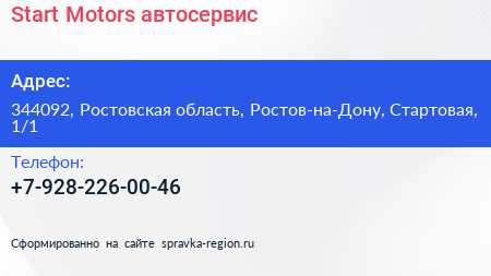 Start Motors, автосервис по адресу 344092, Ростовская область, Ростов-на-Дону, Стартовая, 1/1 в дальнейшем Организация, размещена в следующих категориях: